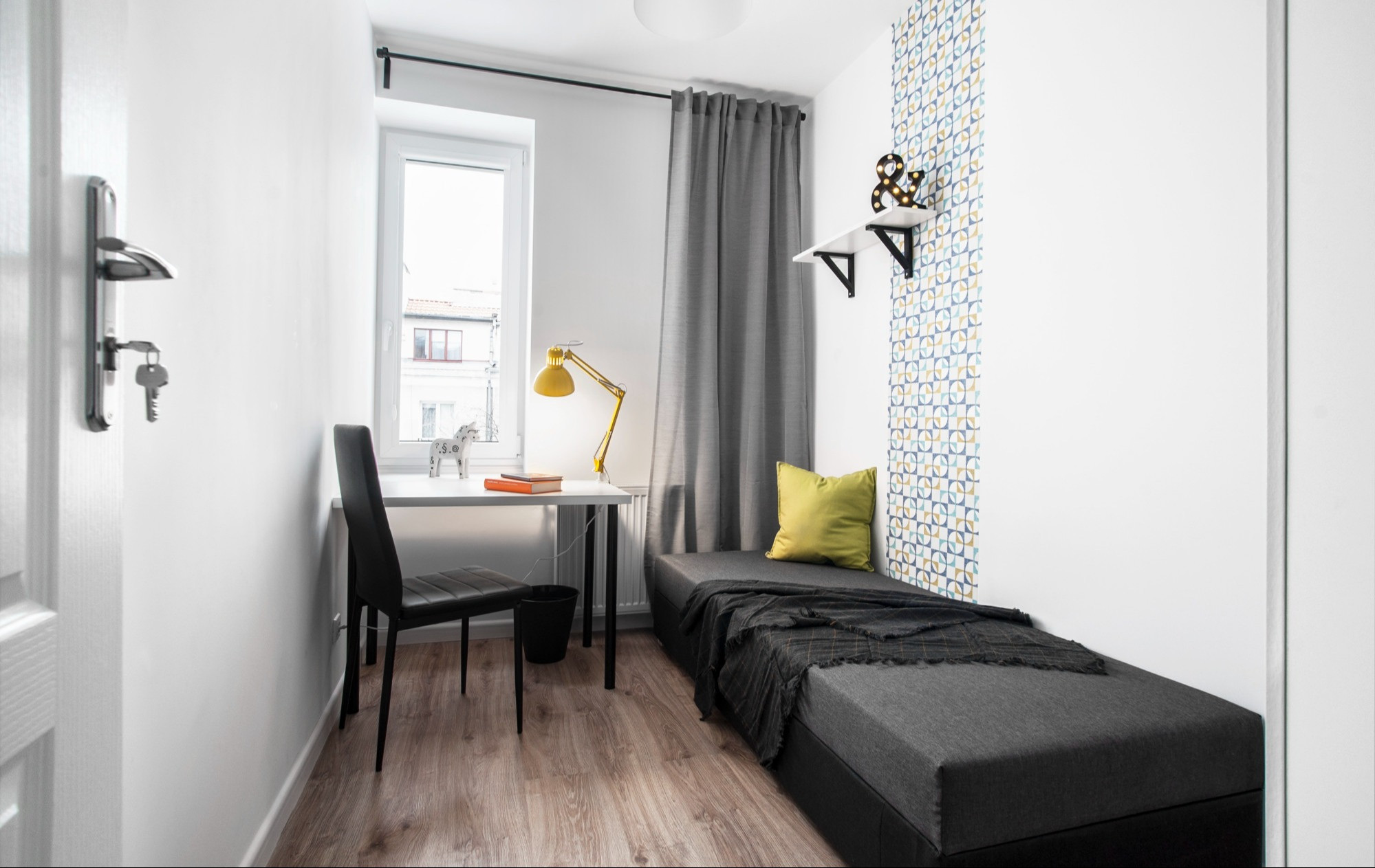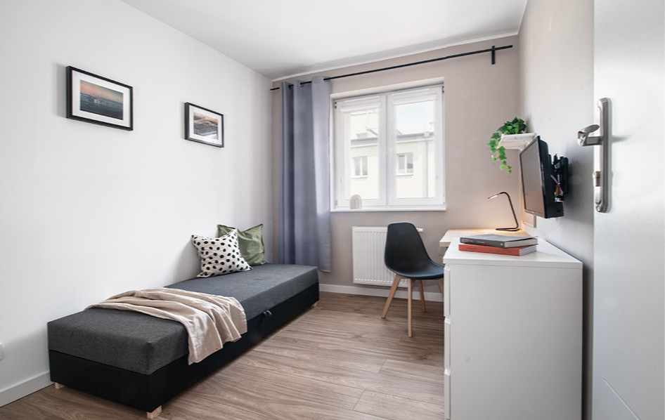 Nieruchomość po generalnym remoncie. Pokój w pełni wyposażony - łóżko, biurko, tapicerowane krzesło, komoda, szafa, półka.
